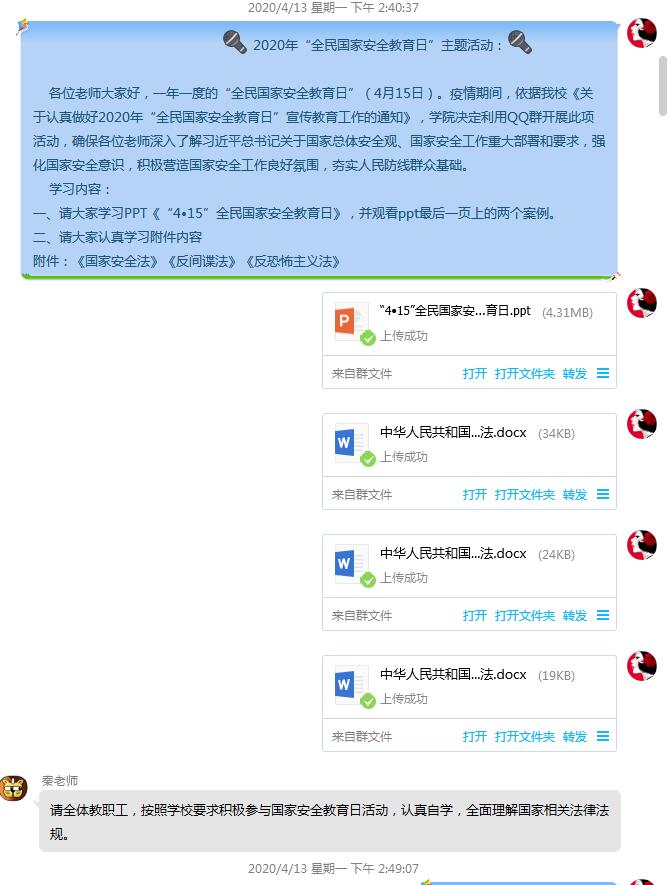 4月13日,疫情期间,英国上市公司365利用QQ群举办了关于全民国家安全教育日的主题活动,党总支书记秦少军担任主讲人,全院教职工参加了活动。