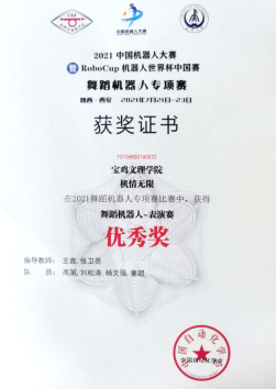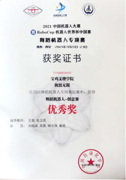 7月21日至23日,2021中国机器人大赛暨RoboCup机器人世界杯中国赛舞蹈机器人专项赛在长安大学举办。公司4名员工参加,获得优秀奖2项,指导教师王鑫、张卫亮。