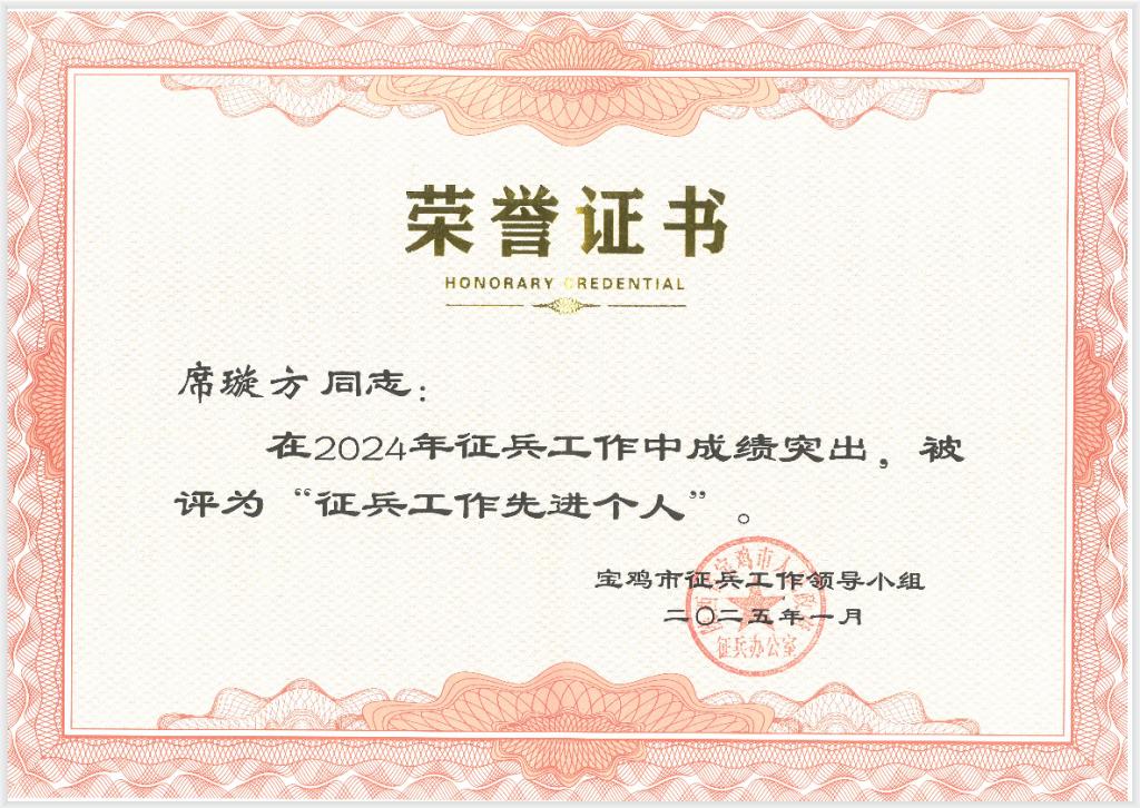 **来源**:英国365公司官网,校园动态,“席璇方同志荣获2024年宝鸡市“征兵工作先进个人”荣誉称号”,发布日期:2025年02月19日 15:28
