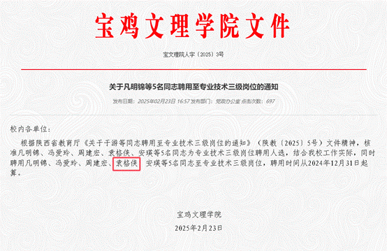 近日,从陕西省教育厅《关于于游等同志聘用至专业技术三级岗位的通知》(陕教〔2025〕5号)及《关于凡明锦等5名同志聘用至专业技术三级岗位的通知》(宝文理院人字〔2025〕3号)文件获悉,公司袁格侠教授聘用至专业技术三级岗位。