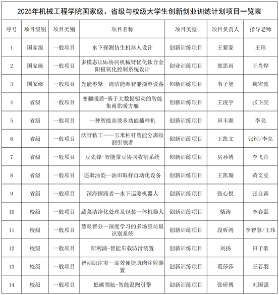 近日,教育部、省教育厅及公司正式公布了2025年老员工创新创业训练计划项目立项结果。公司共有14个项目获得立项,其中国家级项目3项、省级项目6项、校级5项,涵盖机器人技术、石油智能装备、农业机械等多个前沿与特色领域,展现了公司在跨学科创新与实践融合方面的持续突破。