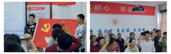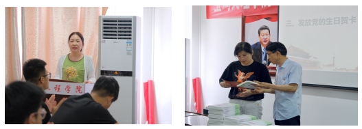 李建峰带领全体党员面向党旗庄严宣誓,王肖烨监誓。随后,李建峰向前半年过党的生日的31名党员赠送生日贺卡和党史读物《新征程、面对面》,教师党员代表袁格霞发言,袁老师作为一名有着26年党龄的老党员表达了自己入党宣誓时的自豪和内心的激动,充分展现了一位老党员对自己身份的敬畏和对组织的崇敬。青年教师党员代表张博老师表达了自己作为一名党员的深刻感悟,他从六个“进一步”号召广大党员学党史、悟初心、践行动。员工党员任希康代表全体毕业生党员发言,他回顾了自己从一名懵懂的学子到一名共产党员的成长和蜕变,深切表达了对母校的感恩,对党组织培养的感激,他表示将不负母校和老师期待,在新的社会实践层面用实际行动践行入党初心,发挥党员作用,为中国共产党建党100周年献礼。组织员刘萍做了题为《重温入党誓词 砥砺奋进前行》的微党课。她从五个历史时期回顾了入党誓词的历史沿革,讲述了不同时期入党誓词的深刻内涵、特点和重要意义,以及誓词几经变迁,所展现出来的我们党在发展建设过程中的优秀品质。