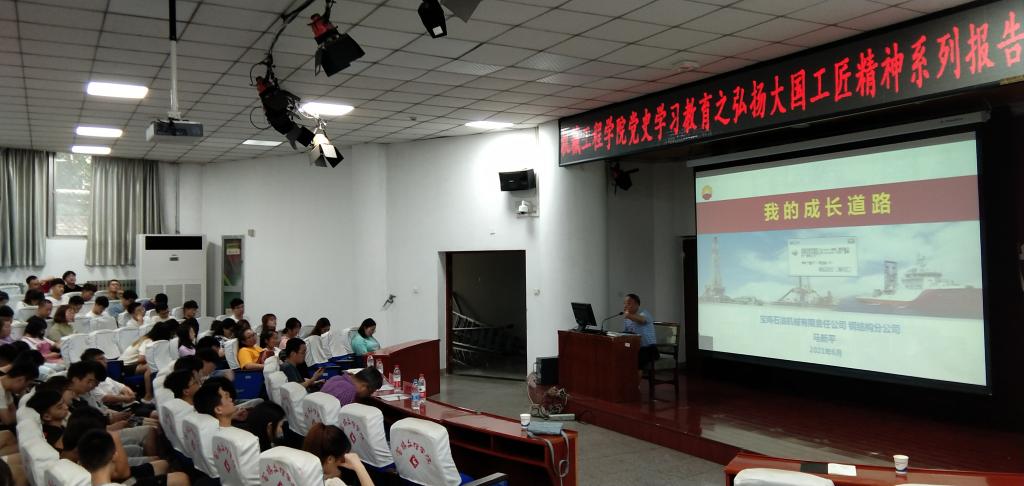 在综合楼1号报告厅,钢结构分公司专家工作室带头人、全国劳动模范、五一劳动奖章获得者马新平以《我的成长道路》为题,讲述了自己做铆工的工作中的勤奋、守时、爱思考、爱挑战、甘于挑战、乐于创新的实际作为,并以工作中的具体案例为同学们呈现了他工作中的情怀与担当。后,段建飞从加强学习、锻炼个人本领;养成好习惯、锻炼出发现问题和解决问题的能力;努力成为一名优秀的共产党员;不计较得失,从长远考虑;学会控制自己的情绪;为人处世、细节很重要等六个方面分享了自己的在工作中的切身感悟,勉励同学们珍惜大学时光、勇于探索求知,不负青春韶华,为同学们上了一堂生动的人生奋斗课程。
