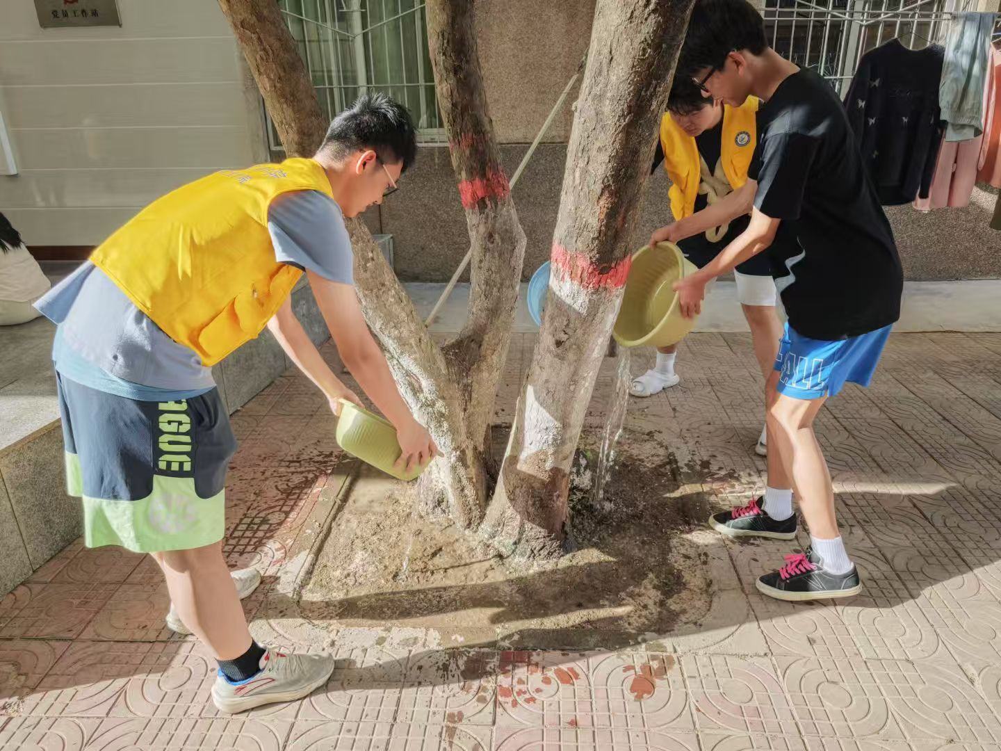 在炎炎烈日下,师生们身着黄马甲,分工明确,拿桶、端盆、拉水管,利用各种浇水工具为花草树木送上“及时雨”,尽管汗水湿透了衣衫,但师生们毫无怨言,脸上洋溢着劳动的喜悦和对校园绿化的关爱之情,一棵棵树苗在“及时雨”的滋润下,重新焕发出蓬勃生机。在师生们的共同努力下,原本因干旱而低垂、枯黄的枝叶,渐渐挺直了腰杆,舒展了开来。一棵棵树苗在“及时雨”的滋润下,重新焕发出蓬勃生机,嫩绿的新芽在微风中轻轻摇曳,仿佛在向辛勤的园丁们致谢。